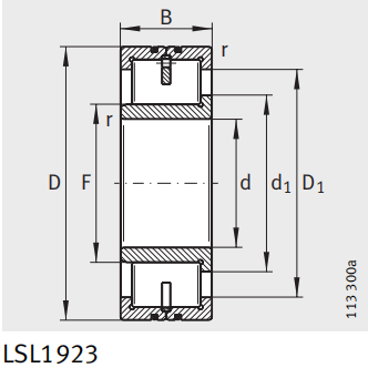 Low friction cylindrical roller bearings LSL and ZSL are of a single row, self-retaining design and correspond to dimension series 23. The bearings have solid outer rings with two ribs, the inner rings are designed with one rib. The inner ring is removable and thus allows easier mounting of the bearings. The disc cages or spacers prevent the cylindrical rollers from coming into contact with each other during rolling.Cylindrical roller bearings NJ23..-E and spherical roller bearings 223..-E1 have the same design envelope as LSL1923 and ZSL1923.