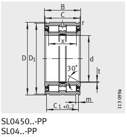 The outer rings have grooves for retaining rings.The inner rings are axially split, 1 mm wider than the outer rings and held together by a rolled-in steel strip.The bearings are available as a light series SL04..-PP and in the dimension series 50 as SL0450..-PP.